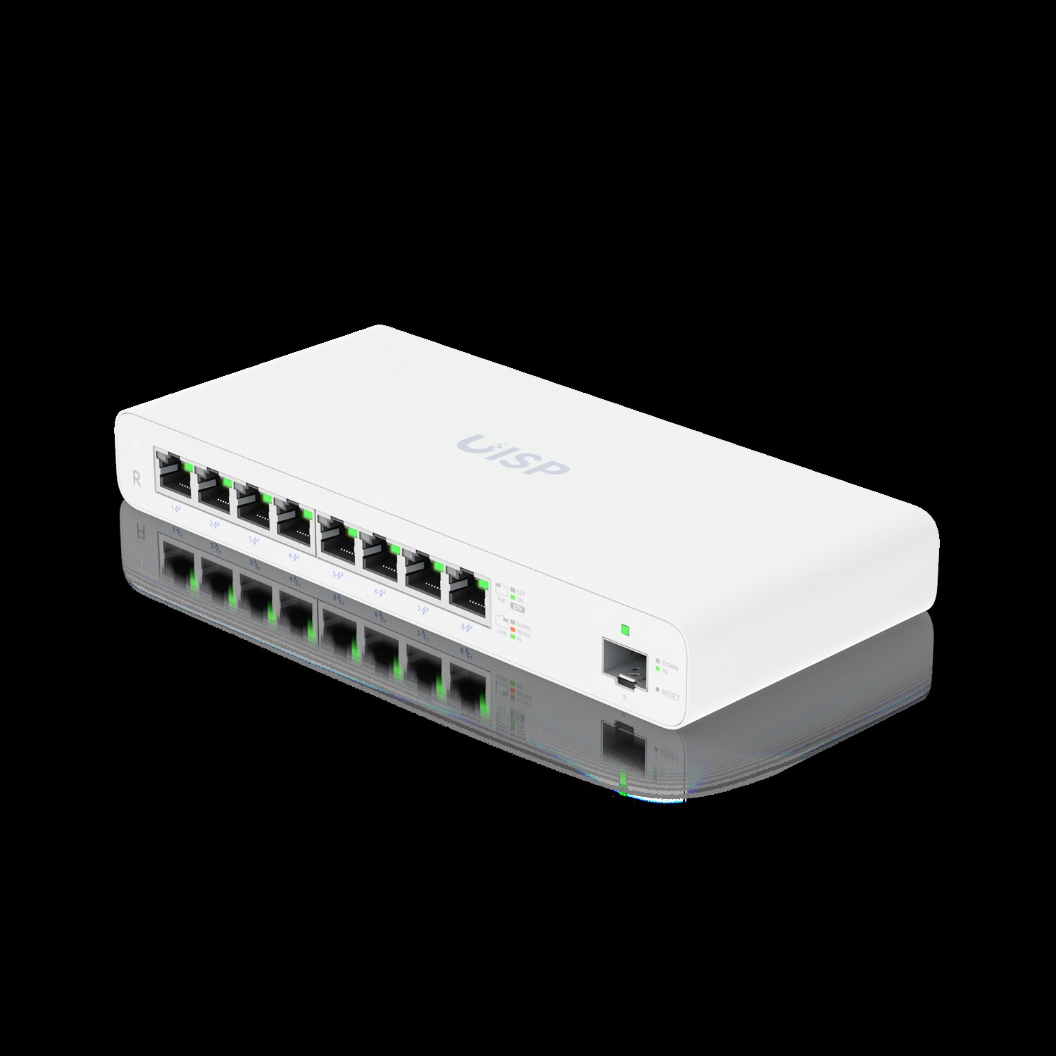 The UISP Router is a eight-port, Gigabit PoE router designed for MicroPoP applications and supporting secure, large-scale networks. 8x GbE RJ45 ports with 27V passive PoE output 1x SFP port 110W (27V) total PoE availability, 15W/port (2-pair) / 30W/port (4-pair) When powered with the included AC/DC adapter. Traffic shaping functionality and automated customer suspension Firewall and OSPF routing